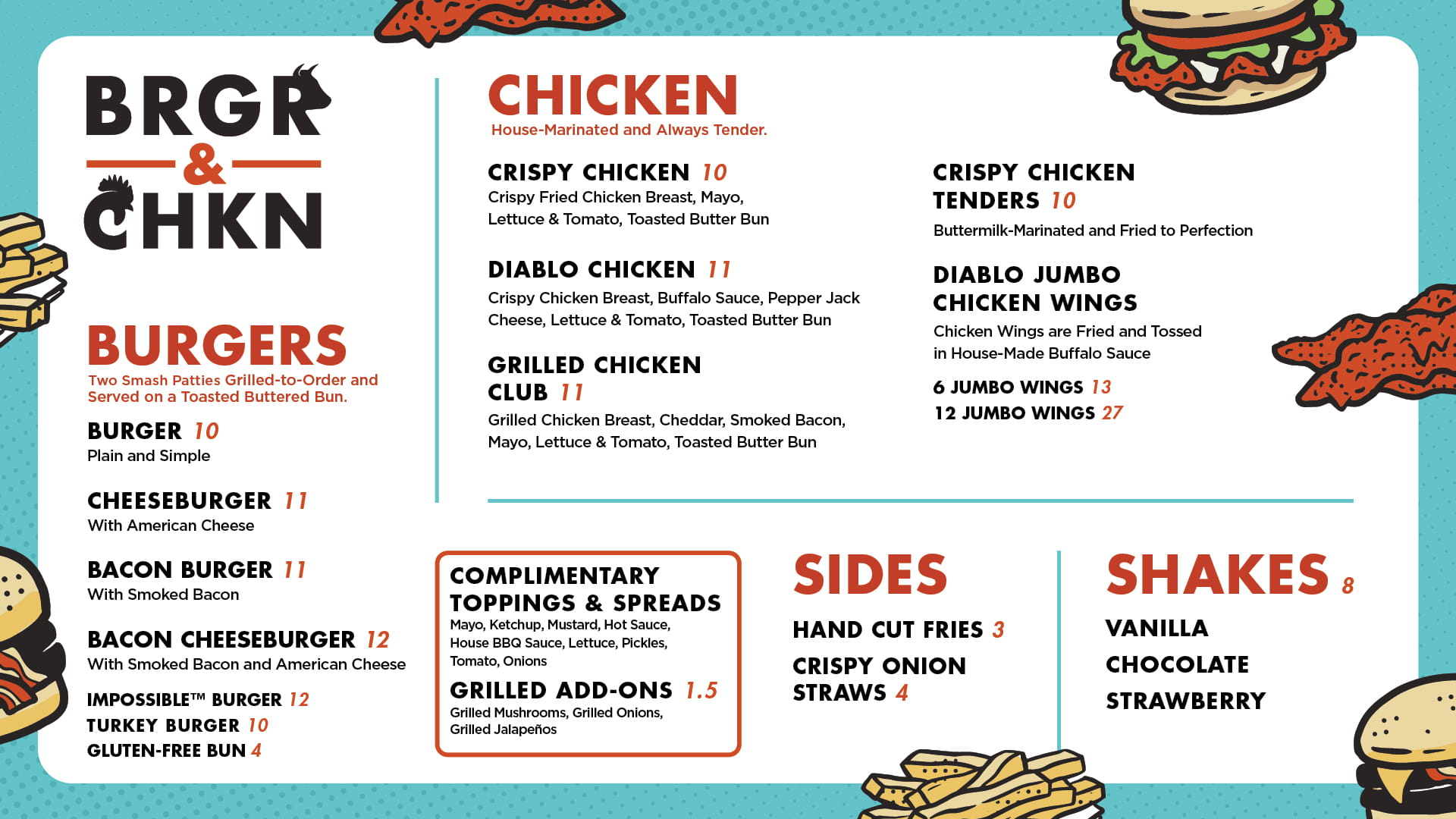BRGR & CHKN brings the best in juicy burgers and crispy chicken to the convenience of Collective Kitchen(s). Traditional and timeless, these thrill-of-the-grill goodies are hand-crafted and full of flavor. From mouth-watering, marinated grilled chicken and golden-brown fried favorites to made-to-order burgers served on with complimentary toppings and spreads on a buttered bun- you’re sure to create the perfect plate.
